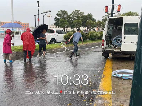 上午10点,经路面作业现场工作人员报告,在神州路与盐渎路交界处,最深积水达到15CM以上。应急小分队接到指令后,迅速驾驶车辆,运载水泵、水管、铁锹等防汛物资,不到10分钟就迅速赶到现场。在公司负责人刘凤权、孙荣才等人的现场指挥下,抢险人员立即查找造成堵塞积水的原因。经过查找发现,原来积水处只有一个下水道,无法快速排水。刘凤权当机立断,指挥抢险人员立即撬开附近窨井盖,把水管放进窨井,发动水泵,往不远处的雨水井排水。这时雨越下越大,风越刮越猛,抢险队员们冒着狂风暴雨,不畏雷鸣电闪,齐心协力清理积水,有的发动水泵梳理管道;有的用大扫帚清扫路面积水;有的清理积水中的垃圾杂物……队员各司其职,分工合作,在时间紧迫、环境恶劣的情况下尽力完成排水作业,经过紧急抢排,道路恢复了通畅。