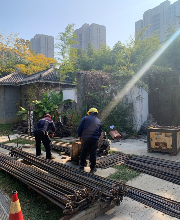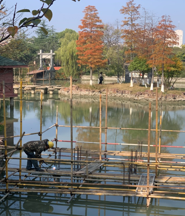 一夜气温骤降,从暖秋进入寒冬,寒风劲吹,但在世纪公园内,呈现在人们面前的却是一派热火朝天的施工景象,机器隆隆,电光闪烁,施工人员顶着寒风,争分夺秒,奋战在施工一线,有的在搭建脚手架、有的在焊割钢材、有的在搬运材料……