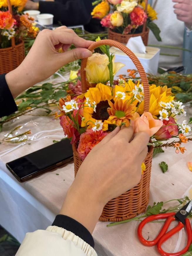 活动现场,花艺老师从花材选取、造型设计、色彩搭配等方面进行了讲授,剪接、绑枝、造型、固定……在老师的悉心指导下,大家专注于手中的花草,尽情发挥、巧妙搭配,一个个错落有致、创意十足的花篮作品呈现在眼前,大家看着自己亲手创作的插花作品,内心充满了成就感与幸福感。