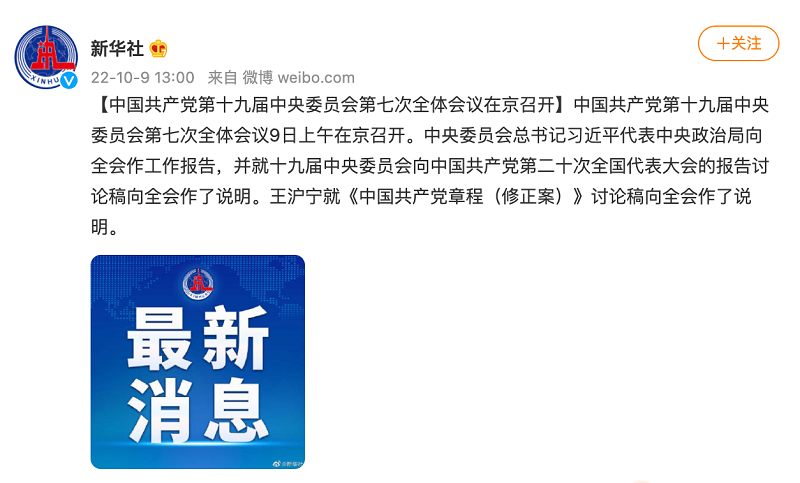 【中国共产党第十九届中央委员会第七次全体会议在京召开】中国共产党第十九届中央委员会第七次全体会议9日上午在京召开。中央委员会总书记习近平代表中央政治局向全会作工作报告,并就十九届中央委员会向中国共产党第二十次全国代表大会的报告讨论稿向全会作了说明。王沪宁就《中国共产党章程(修正案)》讨论稿向全会作了说明。