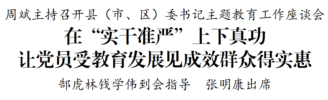 周斌指出,要坚持“准”字发力,找准着力点,提出针对性、差异化要求,突出示范带动、精准施策、有效覆盖,在分类施策、量体裁衣上下真功,推进主题教育见行见效。要坚持“严”字为本,层层压实责任,加强统筹协调,强化跟踪问效,确保不松懈不厌战、不偏向不漏项、不虚化不泛化。各地要增强责任感使命感,以严实作风确保主题教育的政治性、严肃性和时效性,真正让党员受教育、发展见成效、群众得实惠。